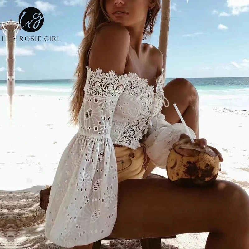 Special Offer Giglio Rosie Ragazza 2019 Bianco Sexy Del Merletto Camicetta Off Spalla Spiaggia di Estate Crop Top Hollow Out Femminile Blusa Discount 49% Today!