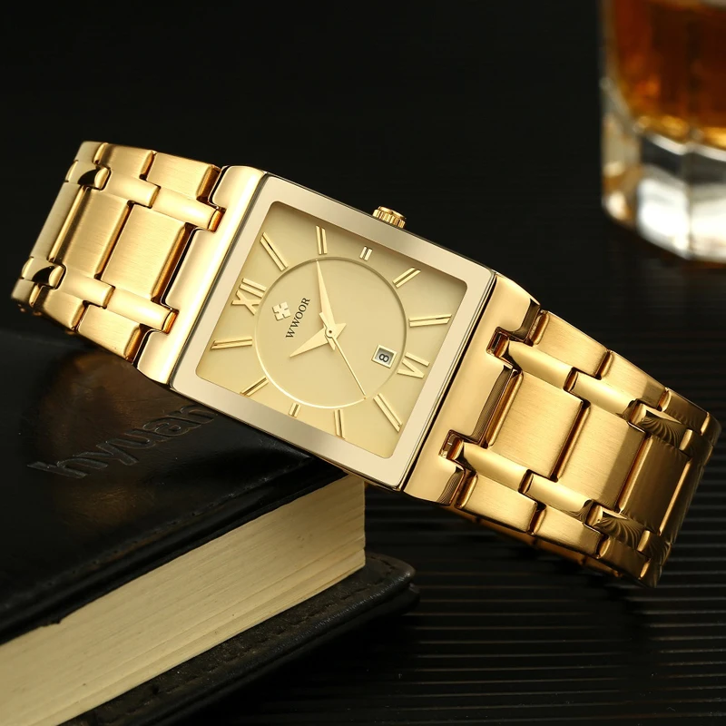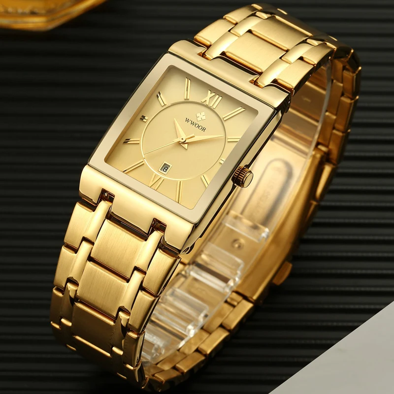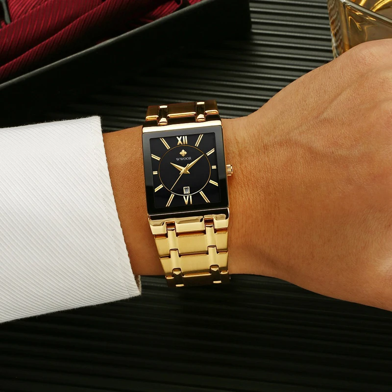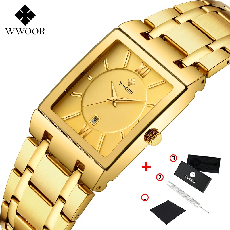 Product Name: WWOOR Mens Di Lusso Orologi In Oro Piazza Della Vigilanza del Quarzo Degli Uomini di Top Brand Data Orologio Impermeabile Del Braccialetto D oro Maschile di Business Orologio Da Polso