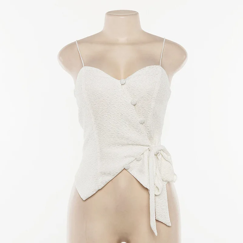 Product Name: Crittografia Elegante Bianco Senza Maniche Sexy Canotta Crop Top per le Donne Della Spiaggia di Estate casual Femminile Magliette e camicette Button Bow Signore Della Maglia