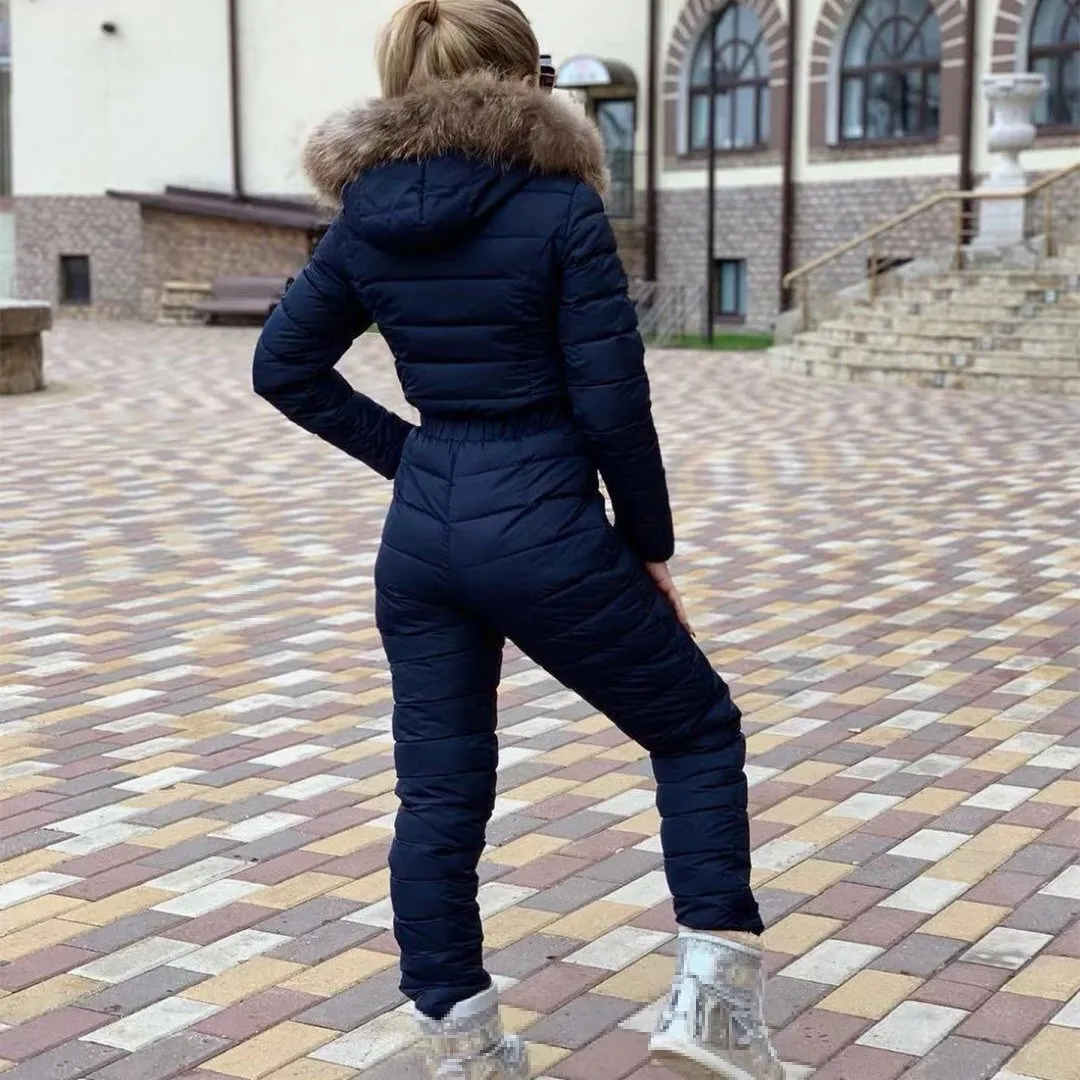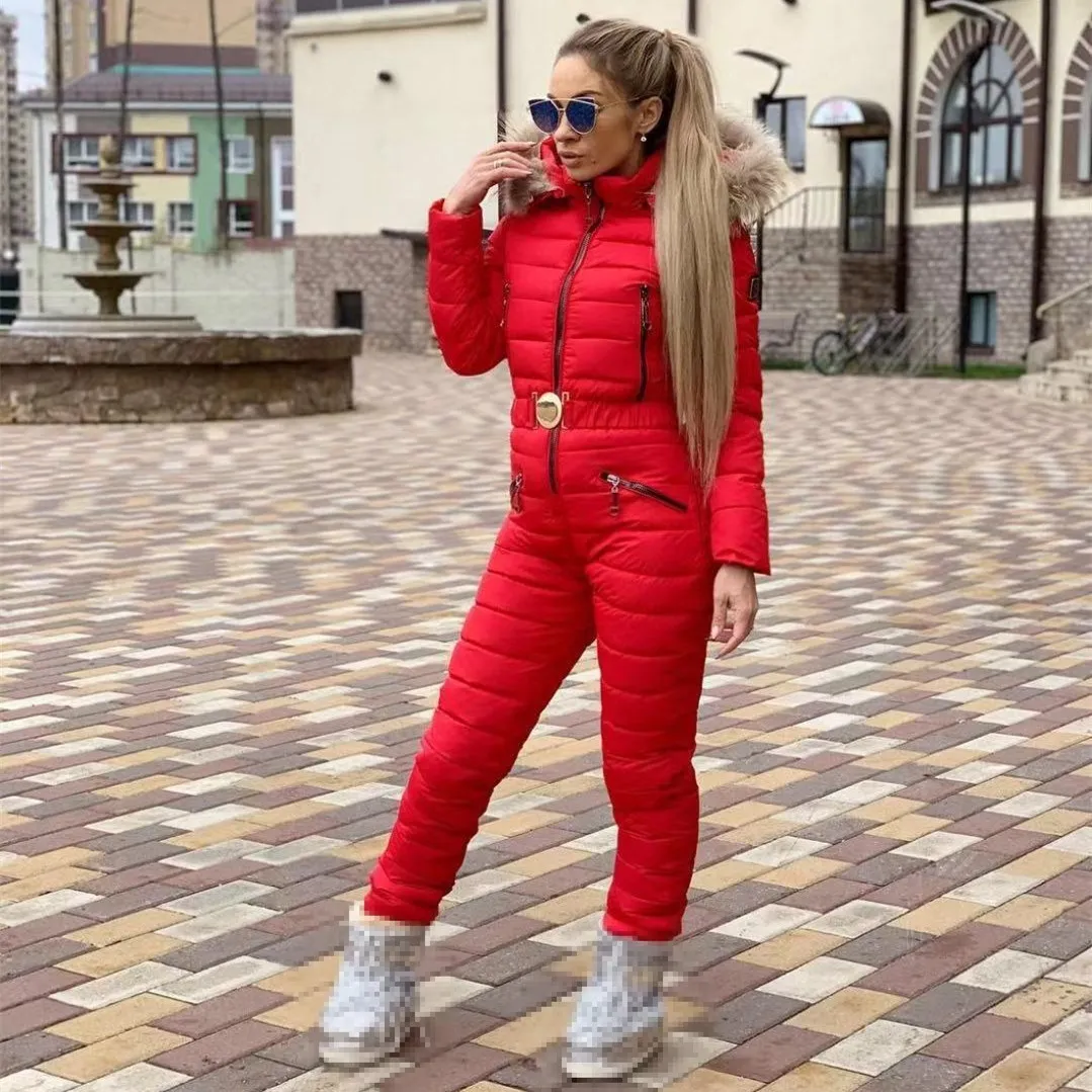 Product Name: Nuovo Inverno Con Cappuccio Tute e Tute da Palestra Parka Elegante di Cotone Imbottito Caldo Fiocchi e Fasce Tuta Da Sci Della Chiusura Lampo Dritto di Un Pezzo Delle Donne casual Tute